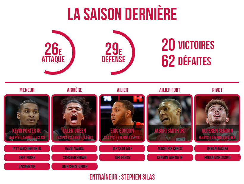 L’envie et la jeunesse ne suffisent pas pour gagner des matches. Le manque d’expérience, de joueurs avec des années au compteur qui savent négocier les matches plus les limites de jeunes éléments encore perfectibles plombent les ambitions et les promesses. Kevin Porter Jr. et Jalen Green font toujours des statistiques mais, faute de justesse technique, ne parviennent pas à faire progresser leur équipe et leurs coéquipiers et leur duo ne semble toujours pas complémentaire. Tyty Washington Jr. n’est jamais loin non plus pour forcer et le jeu collectif est grippé.