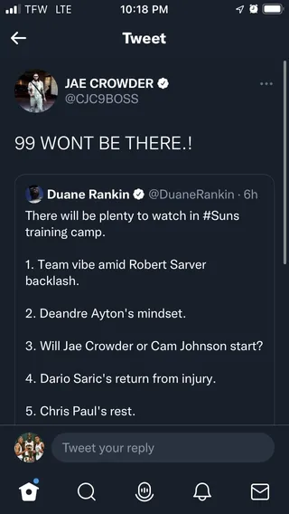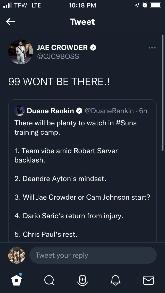 La réponse de Jae Crowder : “99 ne sera pas là”. Une réponse qui a forcément beaucoup agité les fans des Suns, et l'ailier, qui porte le numéro 99, a ensuite effacé son message.