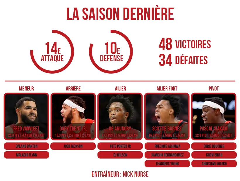 Reste que la densité de la conférence Est n'est plus à démontrer désormais et que le moindre trou d'air peut se payer cash. Cela tombe bien : Toronto sort justement d'une saison sans fausse note, ou presque. « Presque », car celle-ci s'est terminée avec une élimination finalement logique contre Philadelphie au premier tour, et des limites individuelles ou collectives particulièrement exposées.