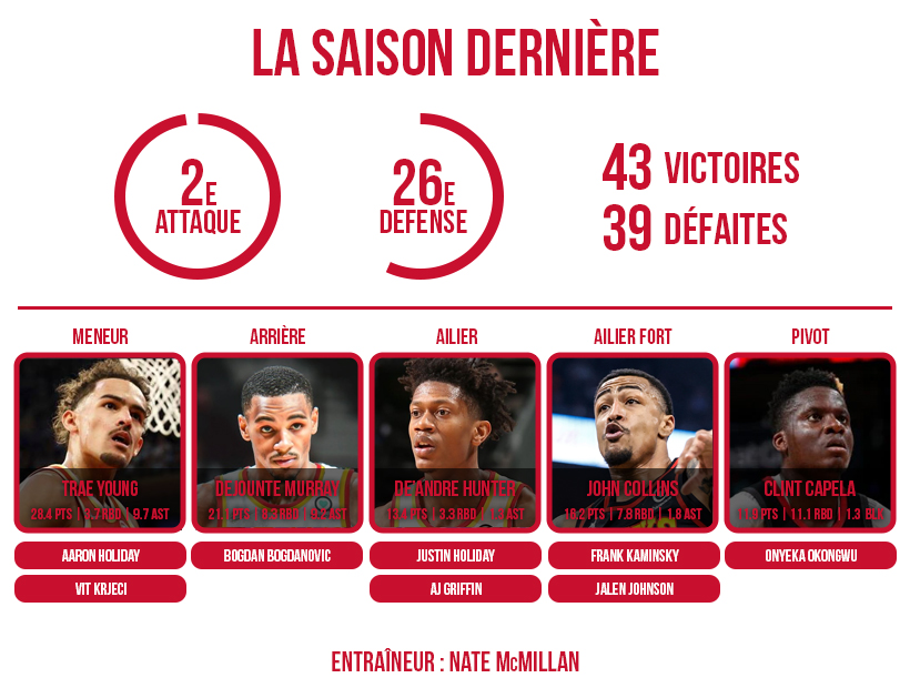 Toujours aussi flamboyants en attaque sous l’impulsion d’un Trae Young plus juste que jamais, et bien entouré par des bras efficaces derrière l’arc (Bogdan Bogdanovic, Justin Holiday, De’Andre Hunter, AJ Griffin), les Hawks peuvent maintenant aussi compter sur une défense respectée, contrairement aux deux saisons précédentes.