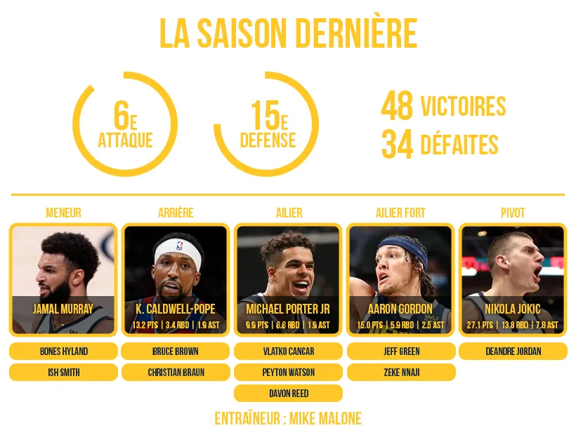 Dans le groupe de tête à l'Ouest du début à la fin de saison, Denver aborder les playoffs avec l'avantage du terrain et y fait figure d'épouvantail avec son effectif armé et équilibré. Et un Jamal Murray plus remonté que jamais !