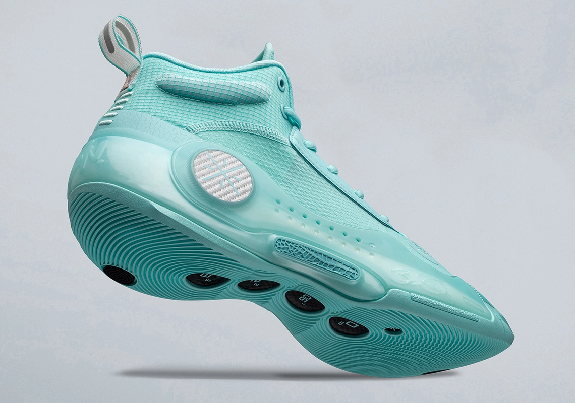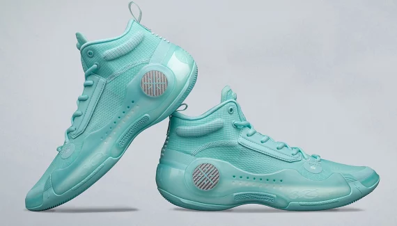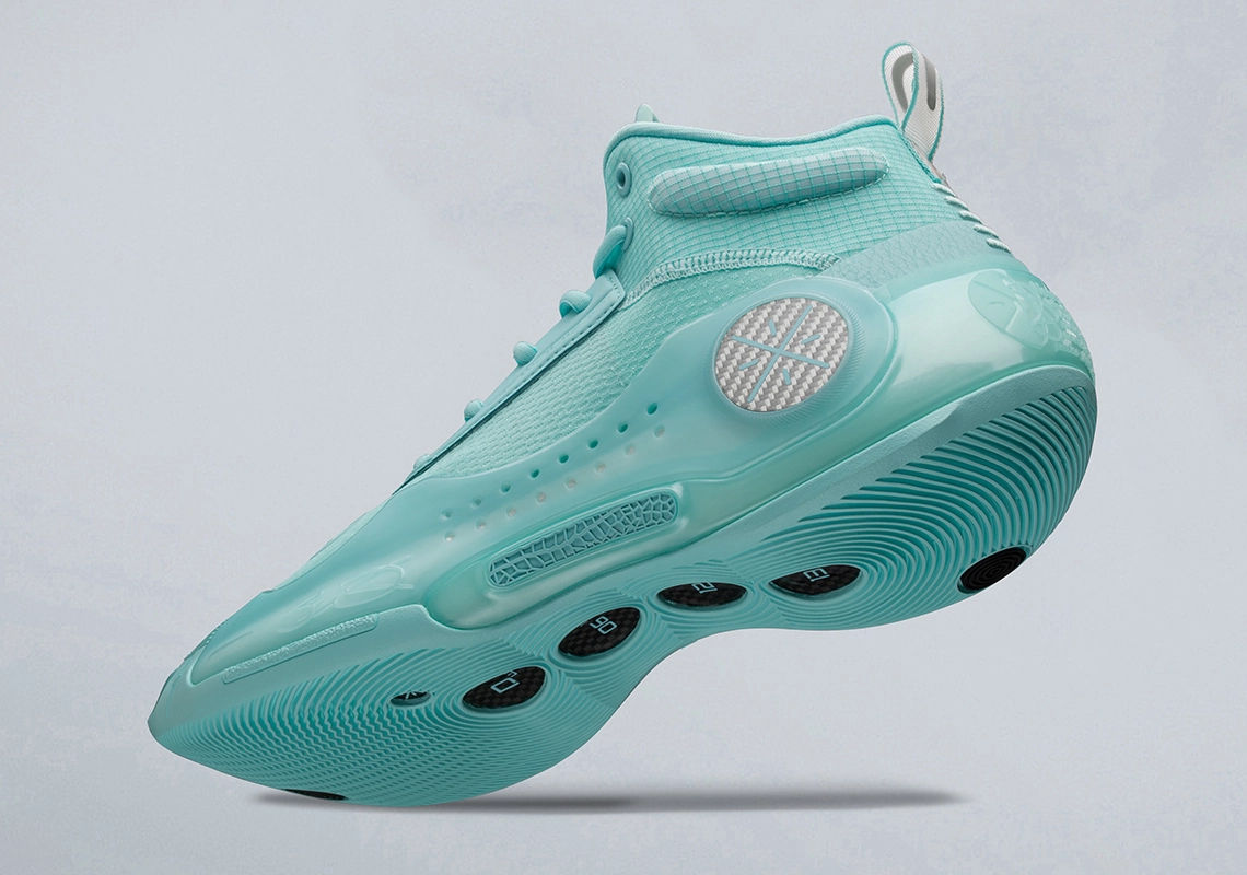 Pour ce qui est du coloris, Li-Ning est parti sur du turquoise (ou plutôt « vert printemps ») sur la majorité de la tige, la languette et sa semelle.