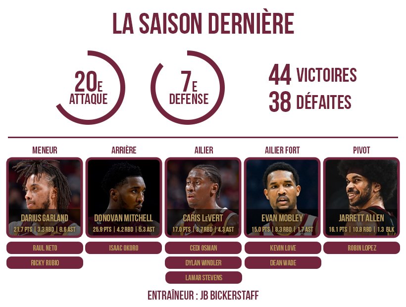 La jeune troupe de J.B. Bickerstaff n’aura de toute manière pas d’autre choix que de performer collectivement, car elle a envoyé la bagatelle de cinq premiers tours de Draft (!) dans l’Utah, pour s’attacher les services de Donovan « Spida » Mitchell. Autant dire que, dans l’Ohio, la pression est aujourd’hui palpable et il faudra la gérer au mieux, en se nourrissant de la déception du printemps dernier (élimination au play-in).