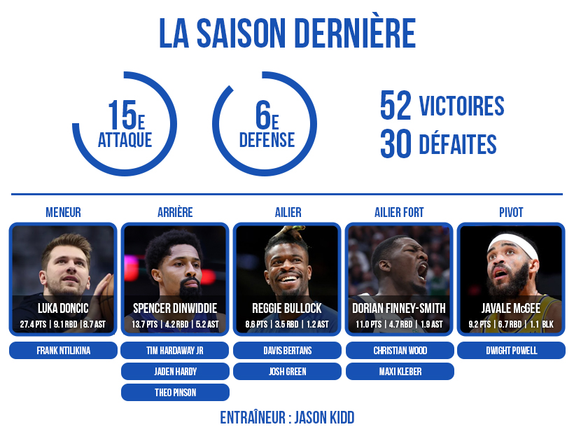 Aujourd’hui, l’heure est venue d’évoquer des Mavericks qui n’ont pas trop changé et qui sont finalistes de conférence en titre, à l’Ouest. Éliminés au printemps dernier par les Warriors, futurs champions, les coéquipiers de Luka Doncic avaient effectivement surpris bon nombre d’observateurs en franchissant deux tours. En demi-finale de conférence, ils avaient surtout écarté les Suns, la meilleure équipe de la saison régulière, après un Game 7 au plus-que-parfait dans l’Arizona.