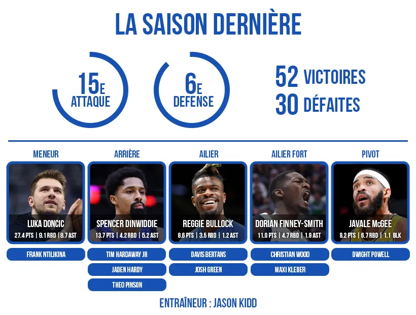 Aujourd'hui, l'heure est venue d'évoquer des Mavericks qui n'ont pas trop changé et qui sont finalistes de conférence en titre, à l'Ouest. Éliminés au printemps dernier par les Warriors, futurs champions, les coéquipiers de Luka Doncic avaient effectivement surpris bon nombre d'observateurs en franchissant deux tours. En demi-finale de conférence, ils avaient surtout écarté les Suns, la meilleure équipe de la saison régulière, après un Game 7 au plus-que-parfait dans l'Arizona.