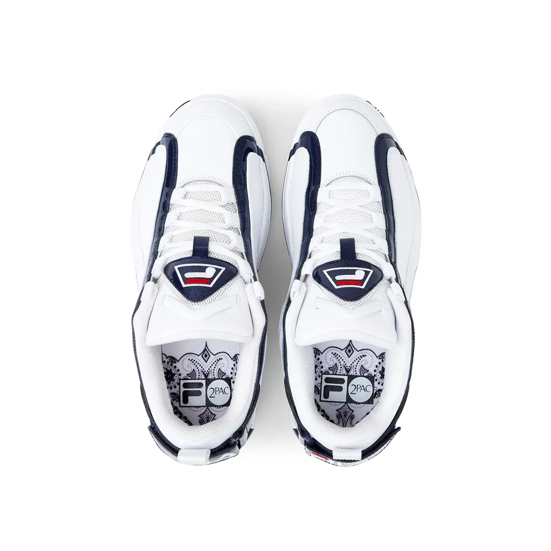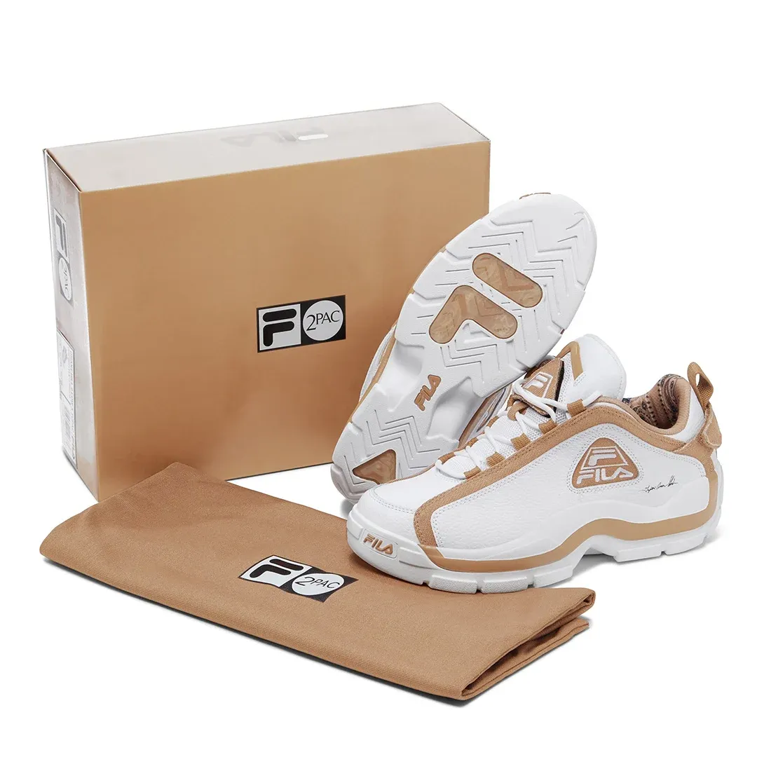 Pour cette édition spéciale, Fila a concocté deux modèles, avec le classique coloris blanc, bleu et rouge et une autre en blanc et marron clair sur lequel figure l'inscription « Tupac » au niveau du talon. Le « co-branding » apparaît également sur la semelle intérieure des deux modèles.
