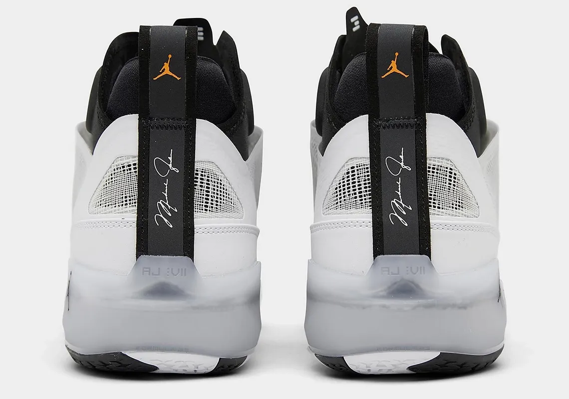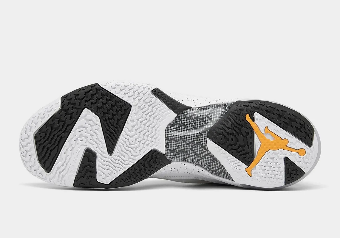 Le modèle se présente donc avec une tige blanche, un col et une tirette noire. Les lacets apparaissent pour leur part en noir et blanc tandis que la semelle extérieure en blanc tacheté de noir repose sur une semelle extérieure blanche et noire. A noter la présence de deux logos « Jumpman » en jaune, sur le talon et sous la semelle.