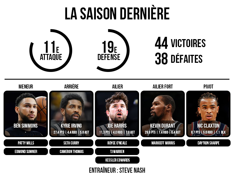 James Harden a demandé à partir, rejoignant les Sixers en cours de saison, et c’est Ben Simmons qui est arrivé, sans pouvoir prendre part à la fin de campagne. Pendant ce temps-là, Kyrie Irving a manqué 52 matches à cause de son statut vaccinal, et Kevin Durant a aussi fait des passages à l’infirmerie. Comment Steve Nash aurait-il pu travailler dans de bonnes conditions ? Résultat : un “sweep” dès le premier tour face aux Celtics.