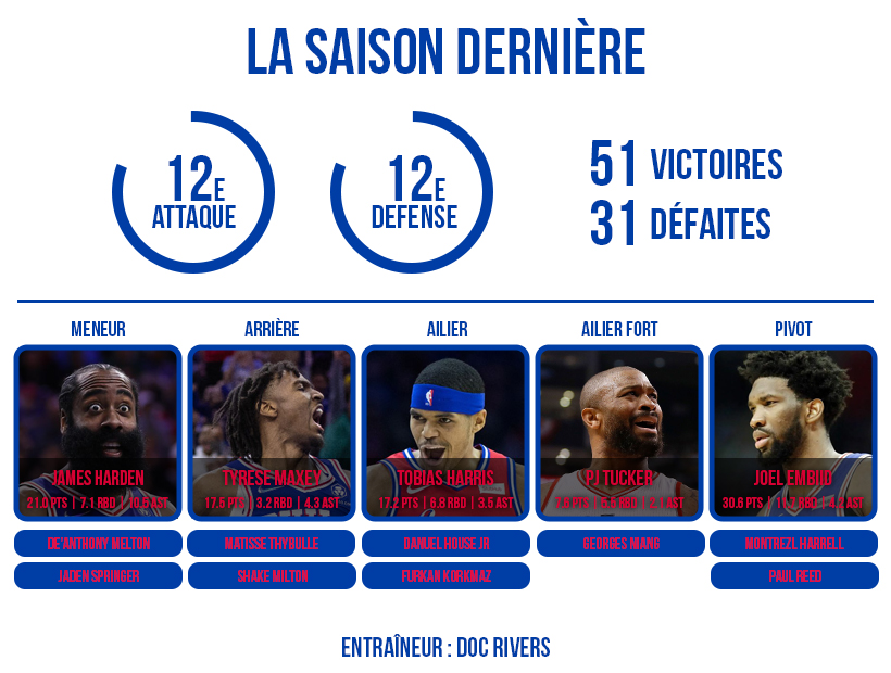 Mais ce nouveau projet a finalement été un succès mitigé, car si les 76ers ont certes remporté 16 de leurs 24 matches restants en saison régulière après l’arrivée de James Harden, ils ont cependant calé, encore une fois, au second tour des playoffs, face au Heat (4-2). La faute, notamment, aux multiples pépins physiques du pivot des 76ers, d’un niveau MVP en saison régulière mais qui a fini sa saison sur les rotules, et au niveau de jeu décevant du meneur, pas au niveau physiquement et globalement sous-performant en Pennsylvanie.