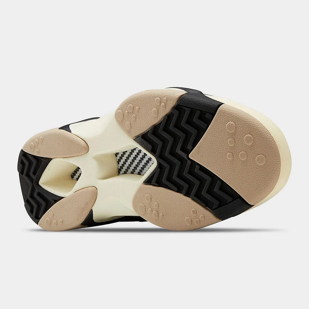 La languette arbore ainsi un smiley jaune au niveau du « pump » tandis que la tige alterne entre un daim lisse sur les bandes en noir et gris et plus épais sur les parties en vert pâle et beige. On trouve également un autre smiley à côté du logo Reebok sur l’empeigne, en jaune. La semelle extérieure est en blanc nacré et beige, assortie de bandes noires.
