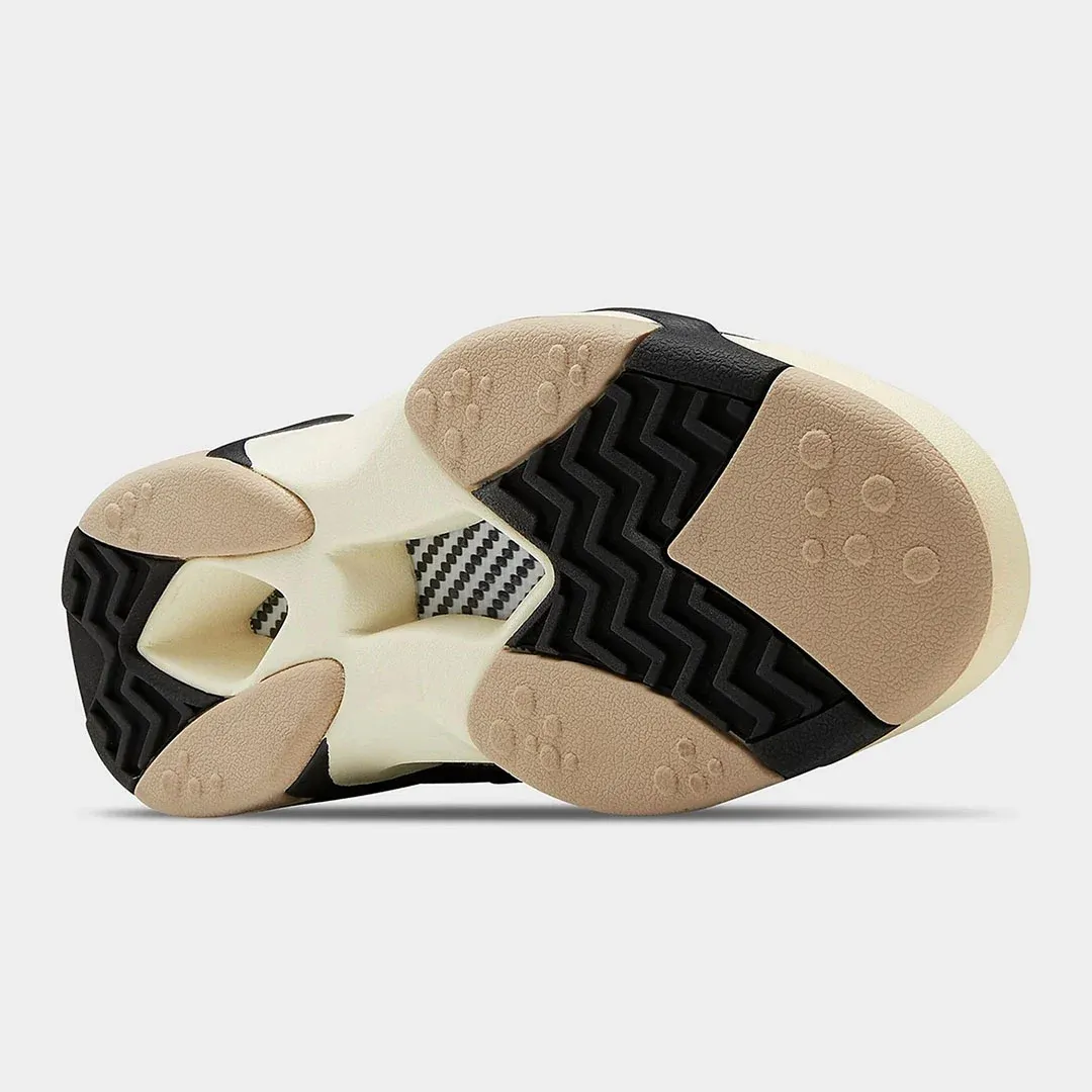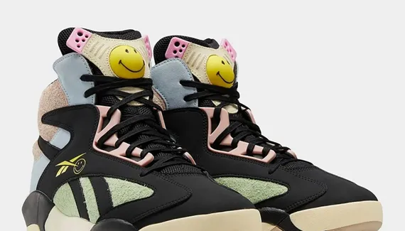 La languette arbore ainsi un smiley jaune au niveau du « pump » tandis que la tige alterne entre un daim lisse sur les bandes en noir et gris et plus épais sur les parties en vert pâle et beige. On trouve également un autre smiley à côté du logo Reebok sur l'empeigne, en jaune. La semelle extérieure est en blanc nacré et beige, assortie de bandes noires.