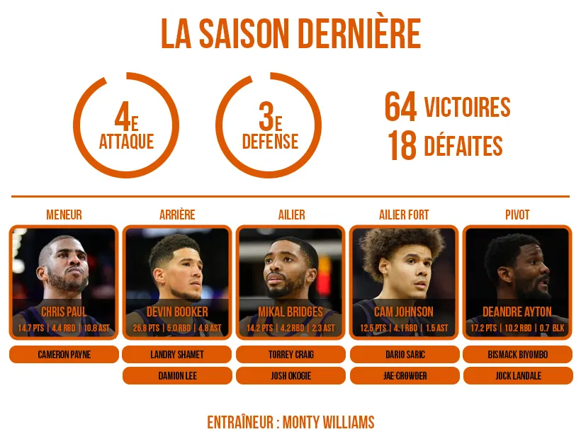 Car les Suns ont tout de même assuré leur place dans le Top 4 de la conférence Ouest, et comme l'équipe ne dépend plus seulement de Chris Paul et Devin Booker pour créer des décalages, elle est beaucoup plus difficile à manœuvrer en playoffs. De quoi effacer la déception de la précédente “postseason”, et retrouver les Finals…