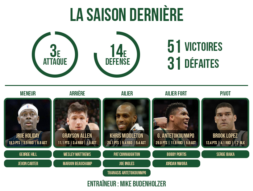 Doté du meilleur « Big Three » de la ligue, Mike Budenholzer peut aussi compter sur des soldats de qualité en soutien de ses trois leaders : de Bobby Portis à Grayson Allen, en passant par Pat Connaughton, Wes Matthews, George Hill, Jordan Nwora, Thanasis Antetokounmpo ou encore Jevon Carter.