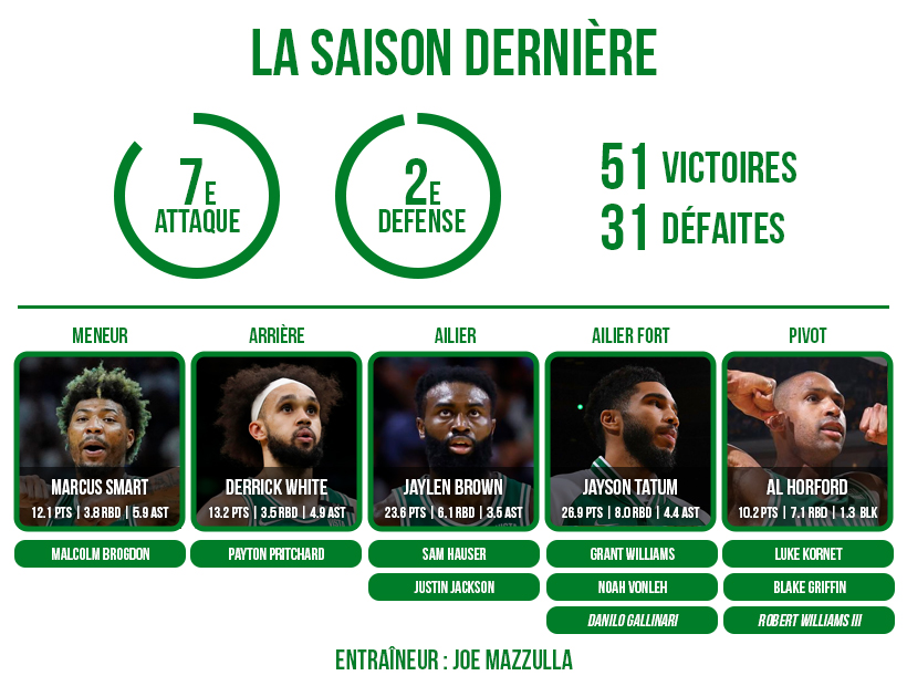 Les Celtics n’ont pas réussi à capitaliser sur leur dernier parcours en playoffs et leur recrutement, se faisant à nouveau dépasser dans la hiérarchie de l’Est par les Bucks, les Sixers, le Heat ou encore les Nets.