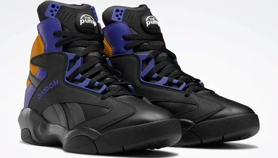 On retrouve ainsi une tige noire complétée de violet et or, principalement au niveau du talon. L’inscription Reebok sur l’empeigne ressort également en violet tandis que le « Pump » sur la languette apparaît en blanc. L’ensemble repose sur une semelle entièrement noire.