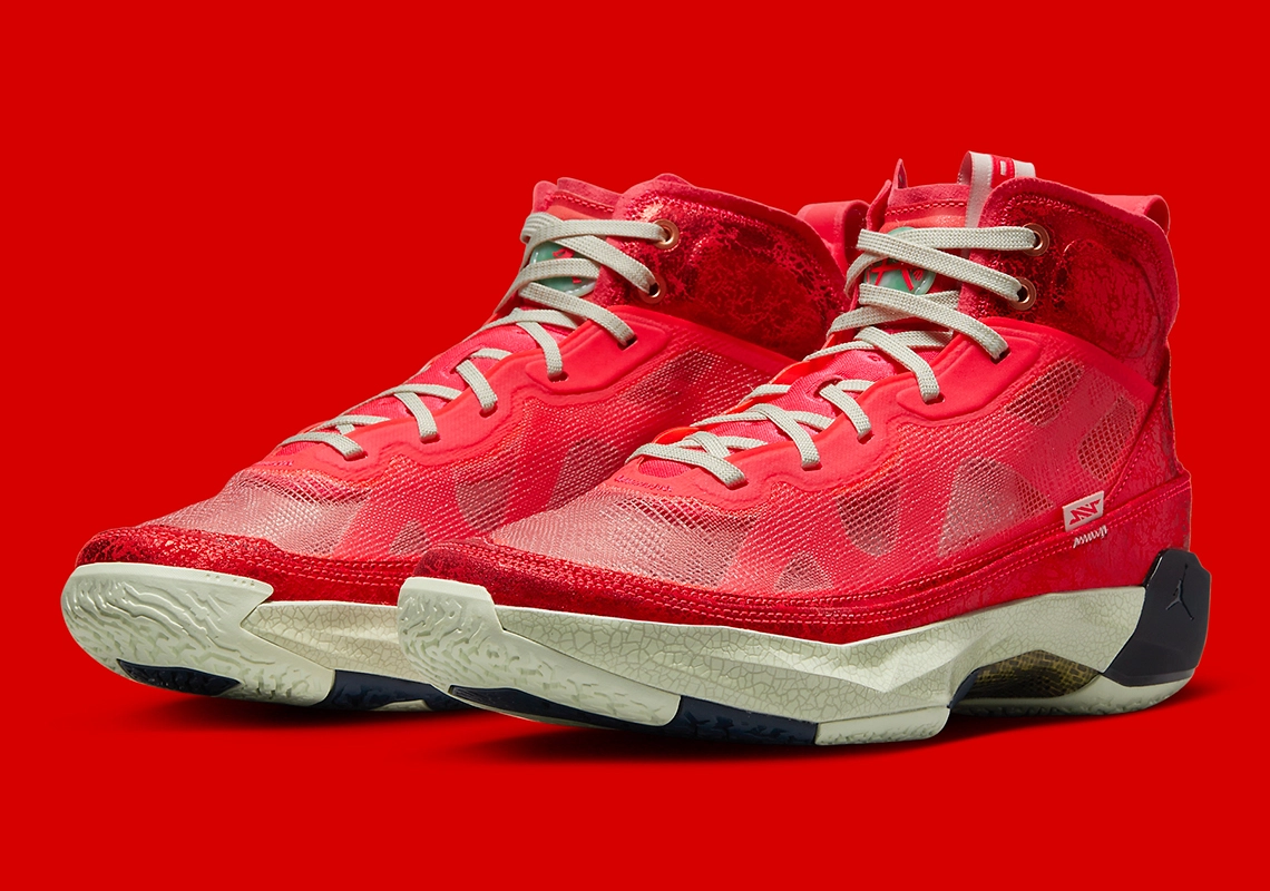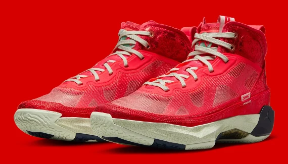 La Air Jordan 37 « Rui Hachimura » se présente avec une tige rouge et une semelle en blanc nacré et noir. Le logo du joueur apparaît sur la languette en rouge sur fond blanc et vert.