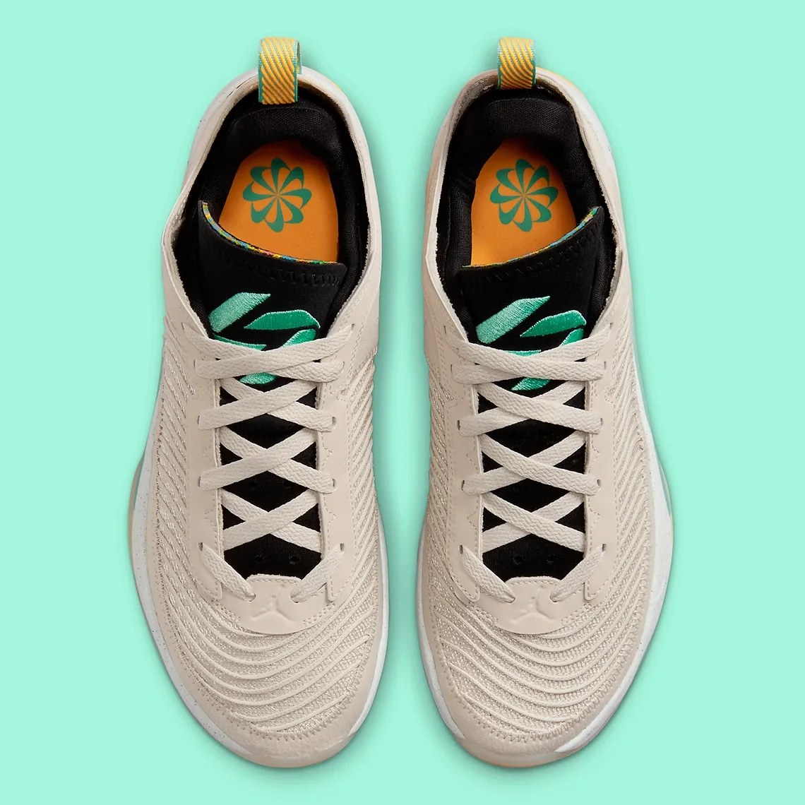 On retrouve une tige principalement beige, une languette en daim noir sur laquelle ressort le logo du joueur en vert, ainsi que des touches d’orange et vert, sur la tirette et au niveau de la semelle, agrémentée d’une mousse « Formula 23 » en blanc tacheté.