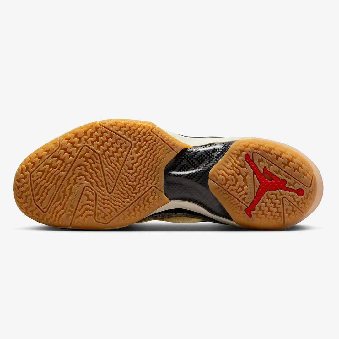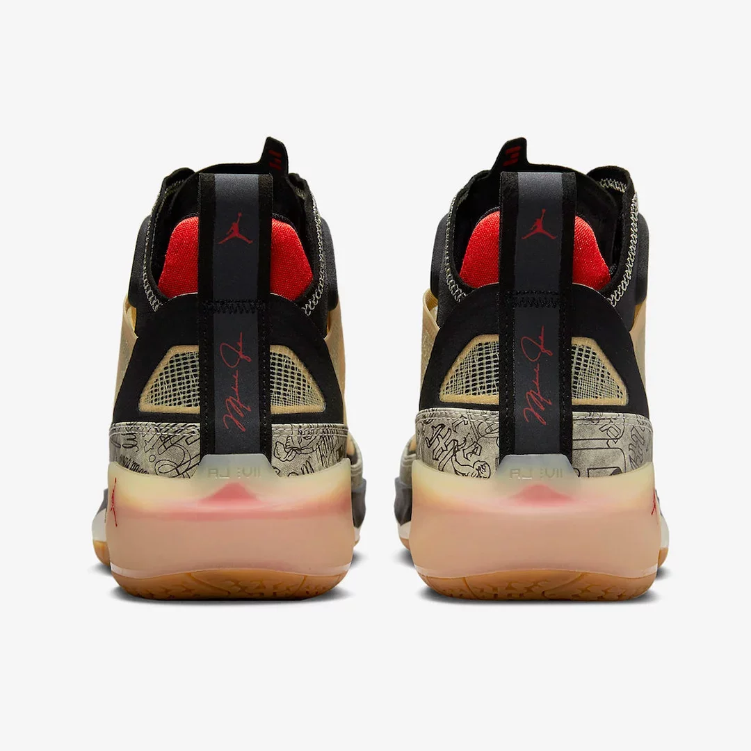 Le haut de la tige en beige est assorti de touches de noir au niveau du col et du talon. Quelques touches de rouge viennent compléter l’ensemble comme les logos de la marque au Jumpman et du joueur, tandis que la semelle offre un mix noir et blanc sur la semelle intermédiaire et une gomme brune marquée par une partie translucide au niveau du talon de la semelle extérieure.