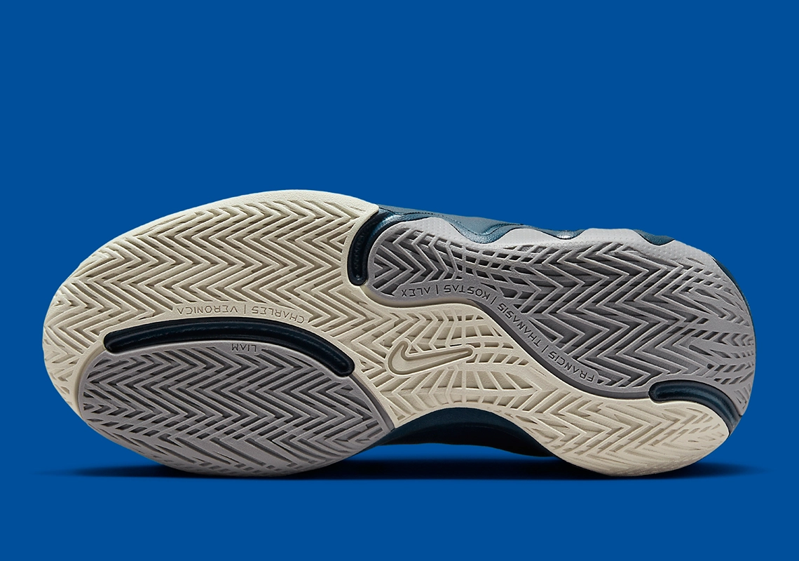 Ce coloris se distingue par une tige bleu foncé dotée de finitions en bleu clair, rose et vert. Le fameux imprimé « floral » se trouve sur la languette et le « Swoosh » inversé sur l’empeigne. L’ensemble repose sur une semelle en bleu foncé, gris et blanc nacré.