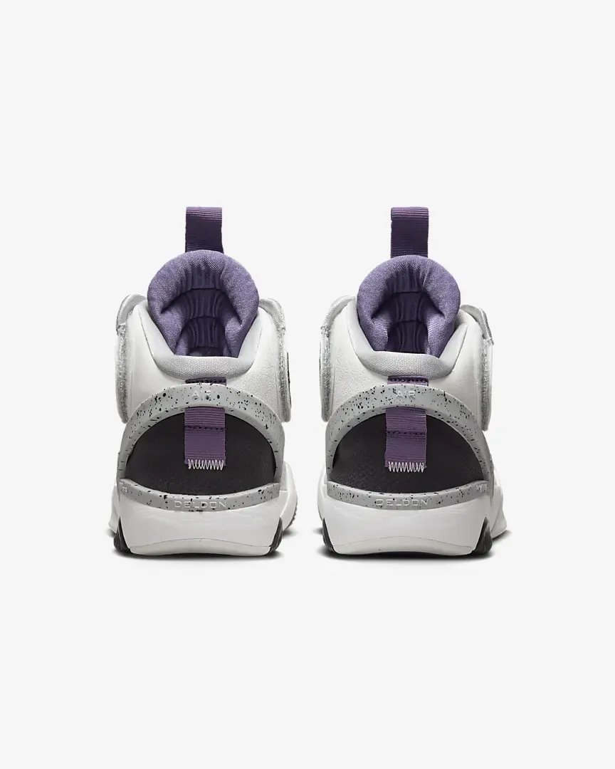 Le fameux talon « rétractable » qui permet à la chaussure d'arborer un design et des caractéristiques différentes, ressort en noir avec une bande violette, entouré par du gris tacheté.