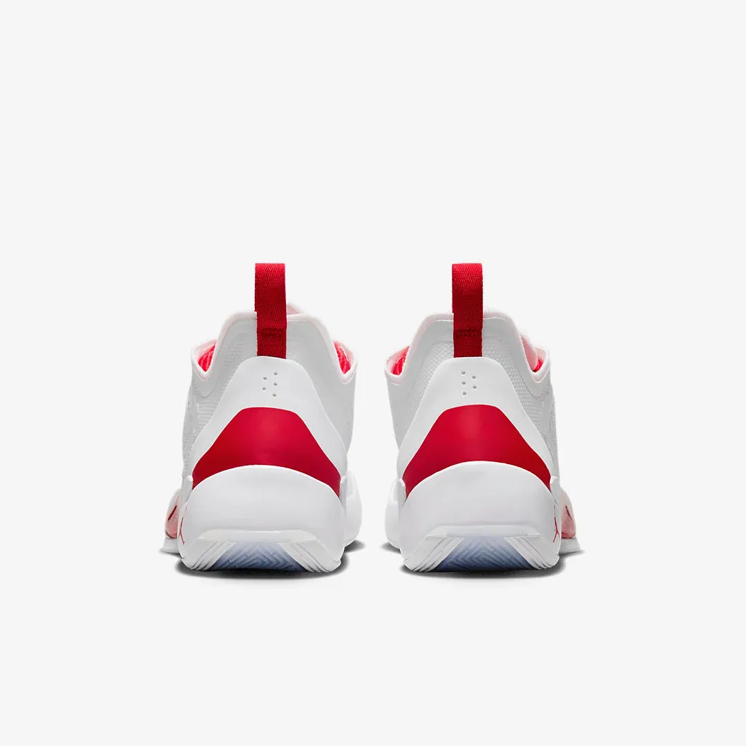 Le modèle à la tige entièrement blanche et donc assortie de finitions en rouge vif au niveau de la languette, de l'intérieur du col, de la tirette et de la semelle. Les logos « Jumpman » ressortent également en rouge.
