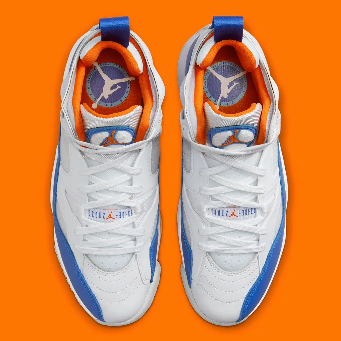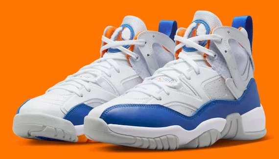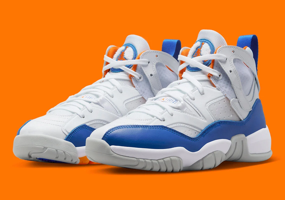 Le logo présent sur la languette s’affiche en orange, blanc et bleu, tandis que le « Jumpman » sur le talon ressort en orange. La semelle extérieure grise arbore les mêmes touches.