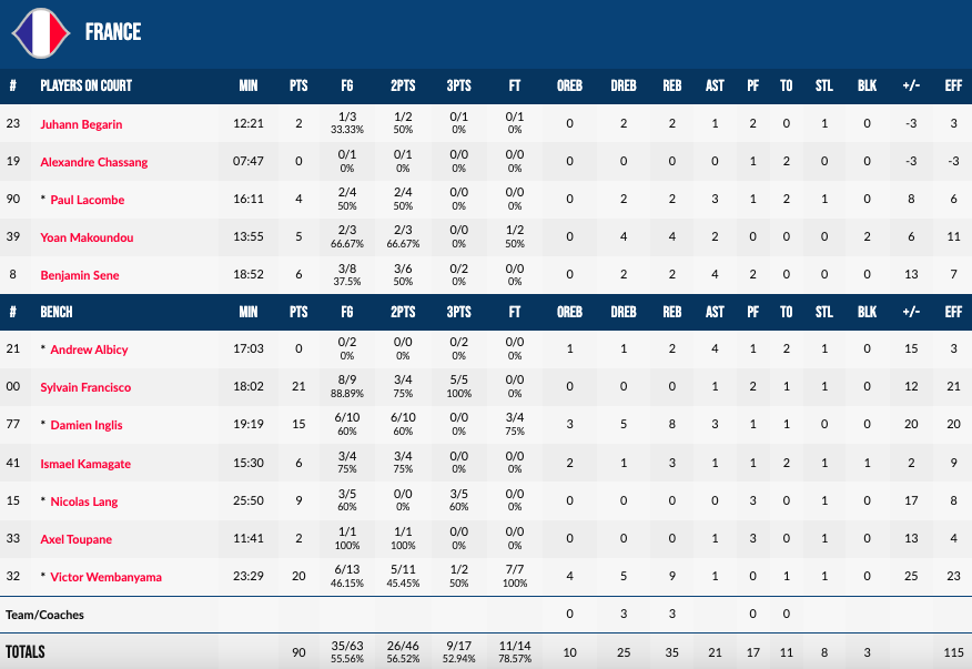 Bien en place défensivement —malgré quelques petits oublis— et autoritaires dans la peinture offensivement, les Bleus ont pris cette rencontre par le bon bout, sous l’impulsion d’un Damien Inglis qui a fait parler sa puissance sous le cercle. Parfois statique et privée de 3-pts, l’attaque tricolore s’est contentée d’appuyer à l’intérieur, se nourrissant de son efficacité en défense. Quant à Sylvain Francisco, il a apporté un coup de boost bienvenu en provenance du banc, pour mettre les hommes de Vincent Collet à +8 après dix minutes (22-14).