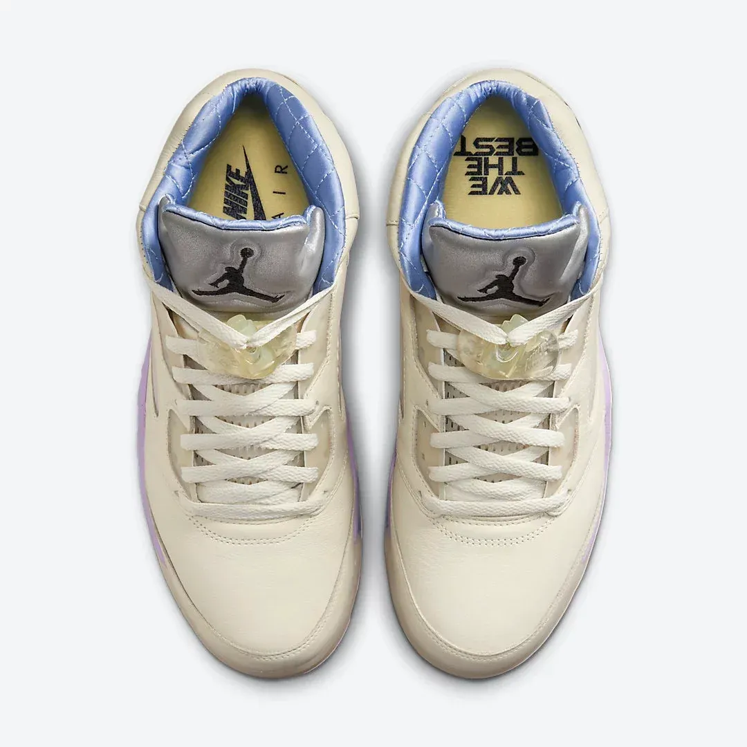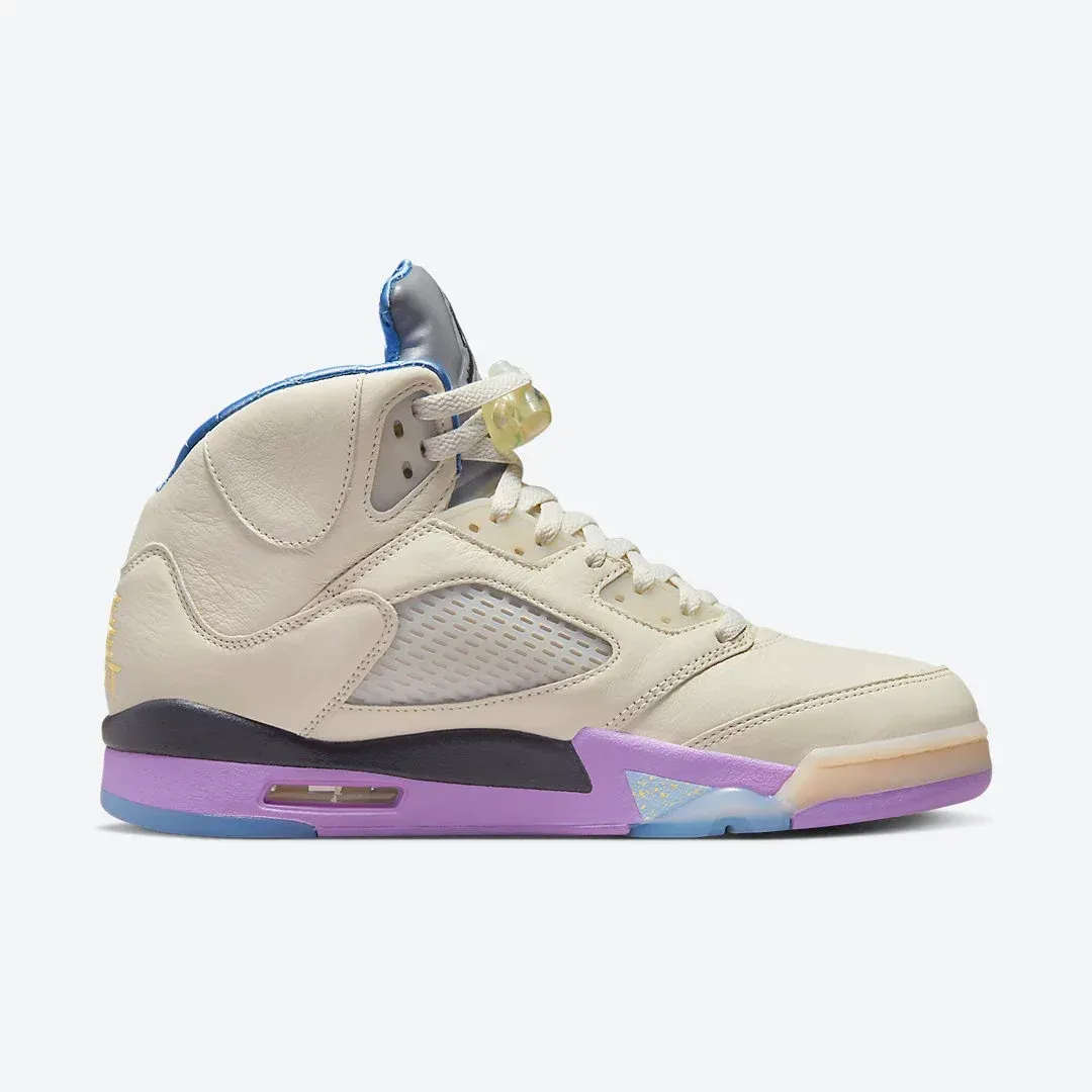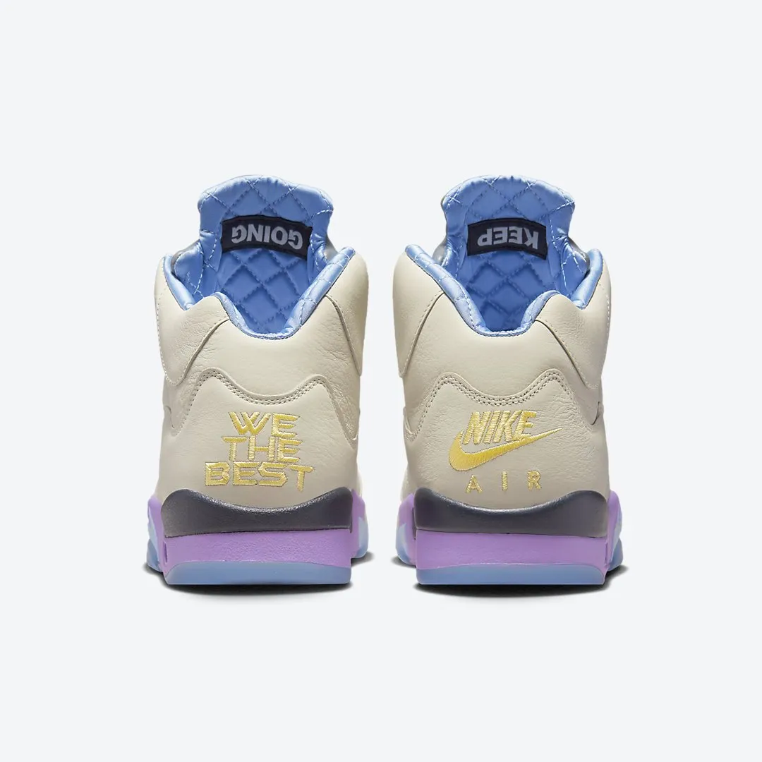 Jordan Brand avait fait appel à lui pour réaliser une collection de Air Jordan 5, ses sneakers préférées. Voici la version baptisée « Sail », dotée d'une tige en blanc nacré assortie d'une languette en gris sur laquelle le « Jumpman » ressort en noir. Les inscriptions « We The Best » et « Nike Air » sur les talons apparaissent en doré. La semelle s'affiche pour sa part en violet, bleu ciel et noir.