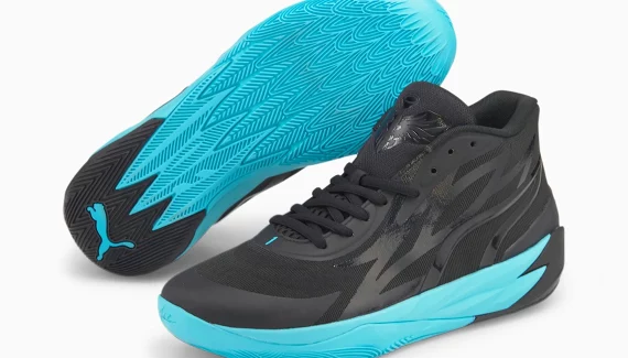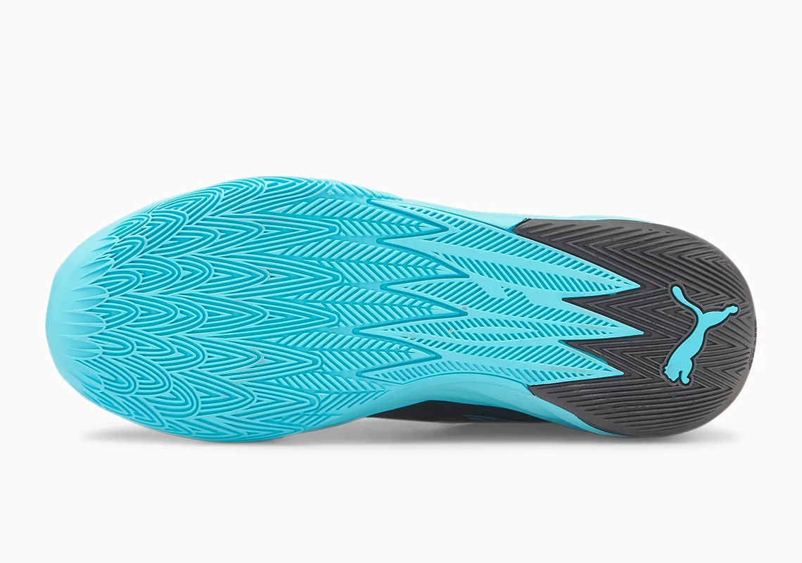 Puma va toutefois passer la vitesse supérieure et après avoir lâché un premier coloris orange, en voici un nouveau, plus sobre. La tige est principalement noire, avec des motifs de « flammes » brillant sur l’empeigne. Le bleu ciel ressort notamment sur les finitions au niveau du talon, de l’empeigne extérieure et sur une majeure partie de la semelle.