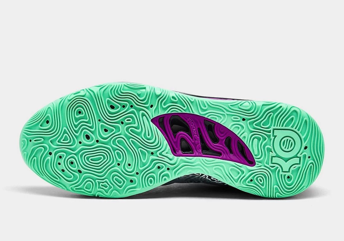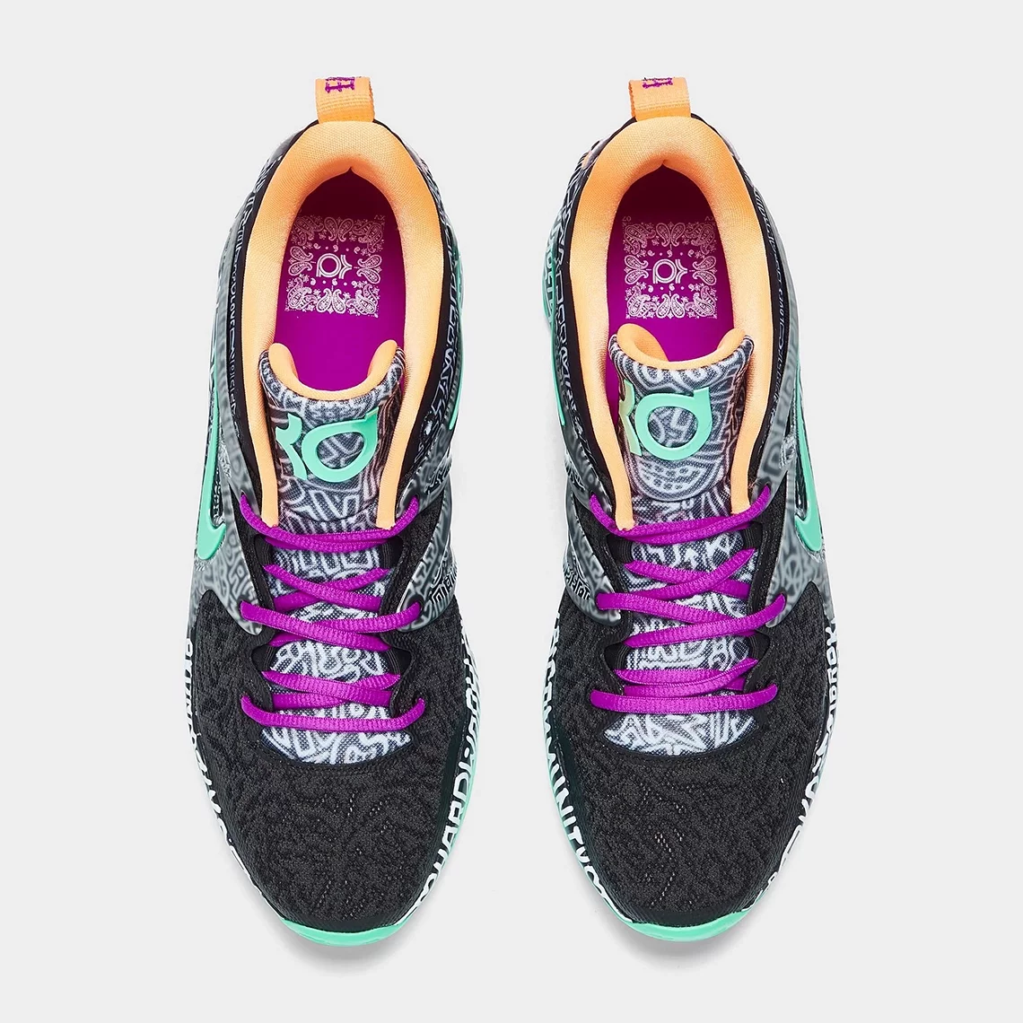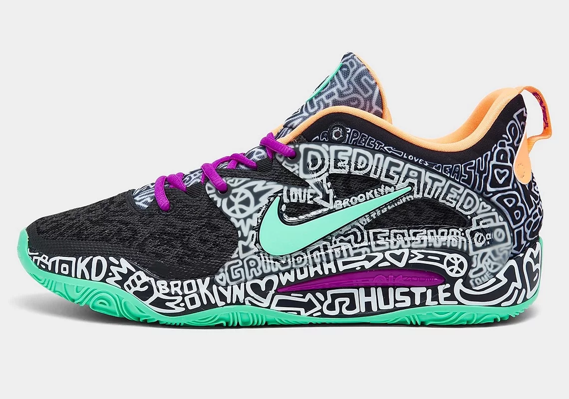 Les nombreuses inscriptions en noir et blanc sur l’empeigne et même la semelle intermédiaire sont un hommage à l’amour du basket, à l’éthique de travail de KD et aux Nets. Des touches de violet, sur les lacets notamment, et de vert, au niveau du logo de KD sur la languette, le « Swoosh » ou la semelle extérieure, complètent l’ensemble.