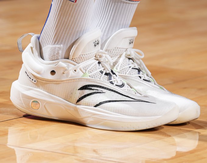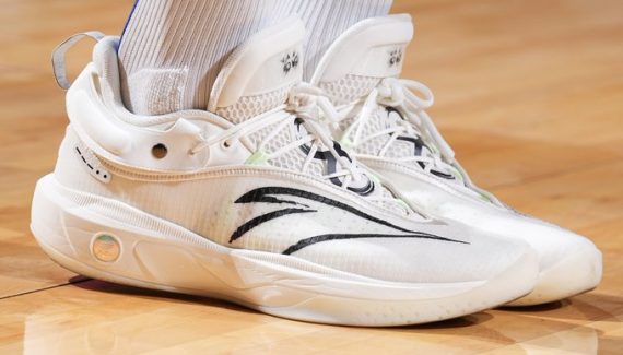La tige s’affiche dans un blanc nacré assez classique, avec le logo de la marque Anta ressortant en noir sur l’empeigne. La semelle en blanc se termine par une partie translucide sur l’extérieur. On peut également noter sur les images du match que Klay Thompson porte ses KT8 sans relever le col.