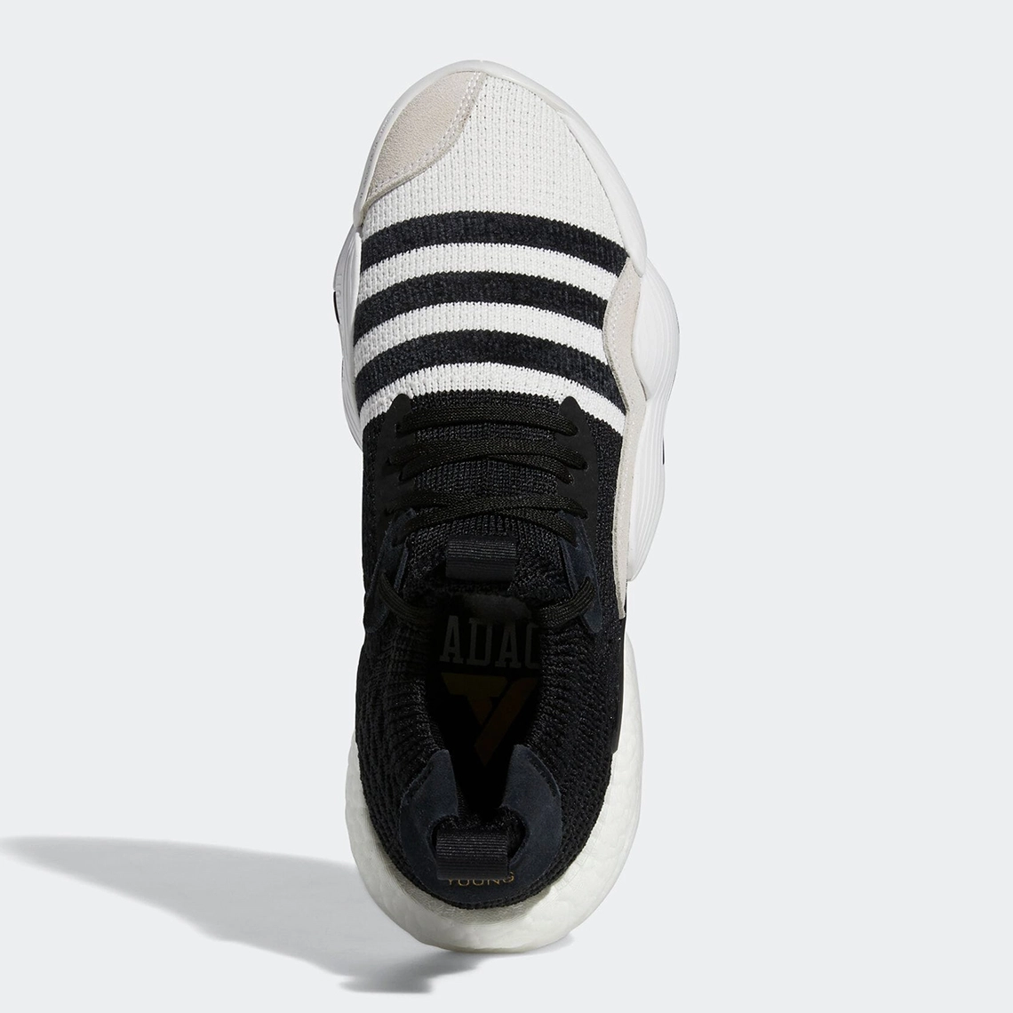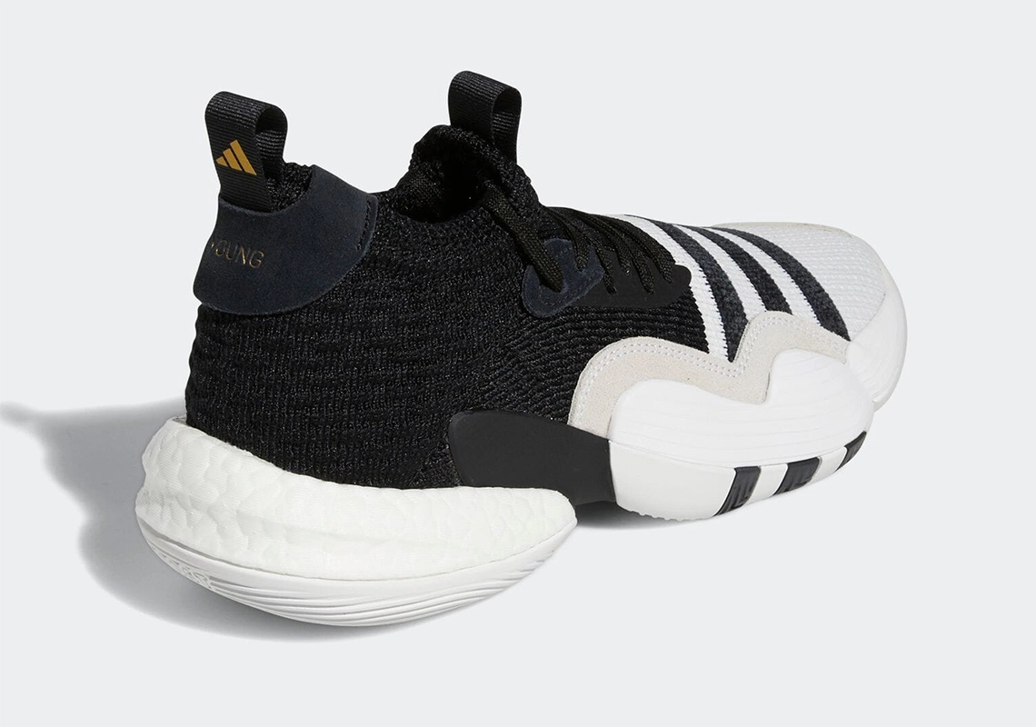 La semelle est également en noir et blanc. À noter la présence de finitions dorées comme sur les logos présents sur la languette et la tirette, et les inscriptions « Trae » et « Young » présents sur le talon.