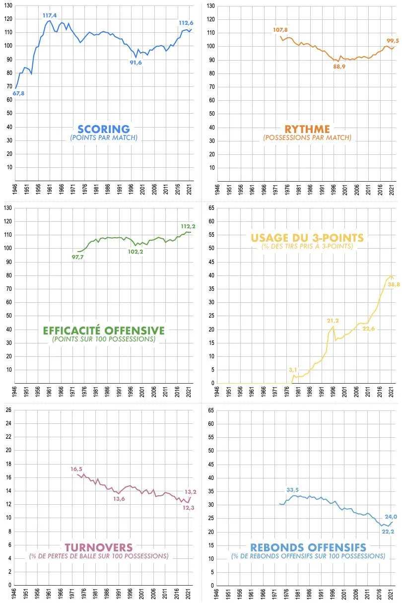 C'est principalement entre 2015 et 2019 que l'explosion offensive a eu lieu, le “scoring” passant de 100 points par match à 111.2. Une explosion liée à l'utilisation du tir à 3-points, dont le taux d'usage (soit le nombre de tirs à 3-points pris par rapport au nombre total de tirs) a presque doublé en dix ans. En 2011, ce taux était encore ainsi de 22.6% quand il était de quasiment 40% la saison dernière !