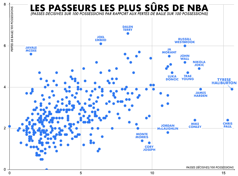 Même s’il a aussi connu des matchs compliqués (7 pertes de balle face aux Nets ou au Magic, 6 face aux Bulls), Tyrese Haliburton perd tout de même très peu de ballon alors qu’il est le meilleur passeur (11.3) de NBA.