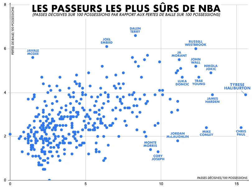 Même s'il a aussi connu des matchs compliqués (7 pertes de balle face aux Nets ou au Magic, 6 face aux Bulls), Tyrese Haliburton perd tout de même très peu de ballon alors qu'il est le meilleur passeur (11.3) de NBA.