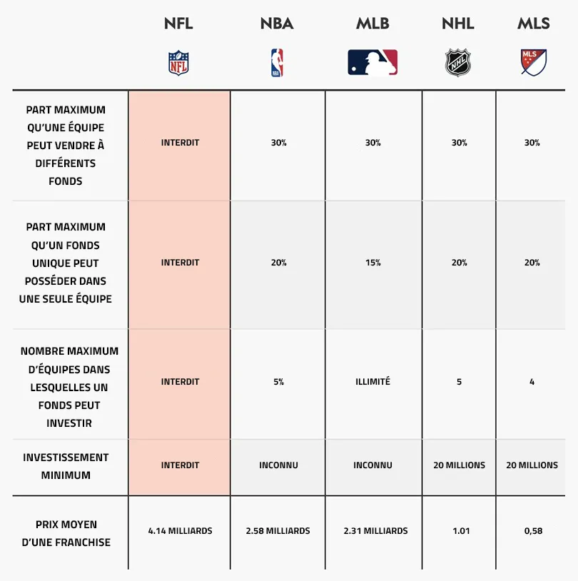 Ces structures d'investissement géantes brassent des milliards de dollars mais la NBA impose des limites. Ainsi, une franchise ne pourra pas vendre plus de 30% de son capital à ces divers fonds, et un fonds ne pourra pas posséder plus de 20% d'une équipe. Un fonds ne pourra pas non plus investir dans plus de cinq clubs différents.