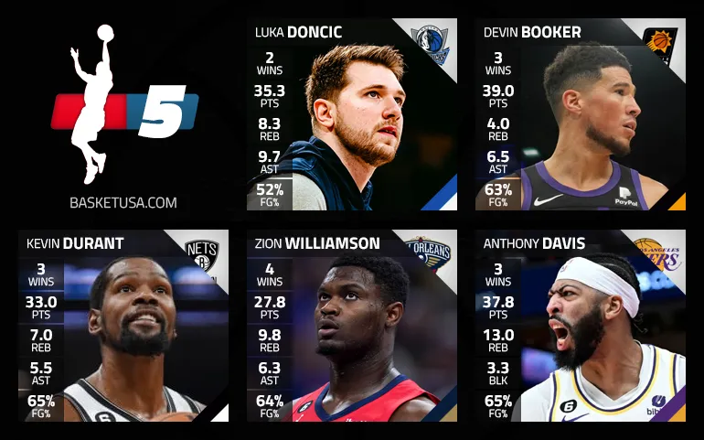 Même s'il y avait quelques autres candidats intéressants, le cinq majeur de la semaine s'impose finalement de lui-même. Sur le “backcourt”, Luka Doncic porte toujours les Mavericks, quasiment à lui seul, alors que Devin Booker est au sommet de son art avec les Suns, plus patron et polyvalent que jamais en l'absence de Chris Paul.