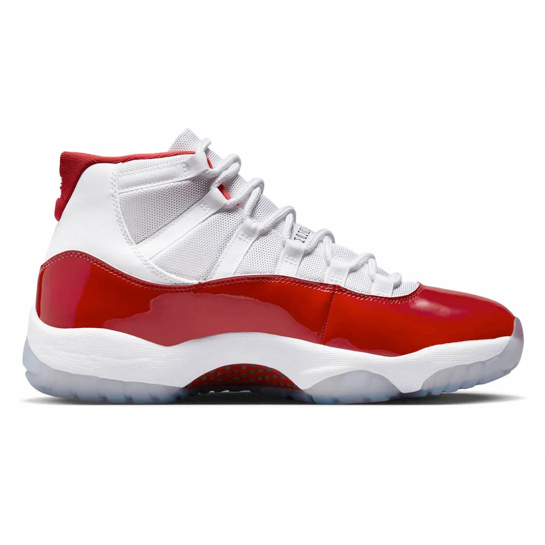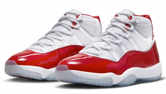 Cette année, Jordan Brand a opté pour le rouge cerise afin de boucler 2022 en beauté. La tige blanche est donc recouverte d’une base en cuir verni rouge « Cherry ». L’intérieur du col et les logos « Jumpman » apparaissent aussi en rouge.