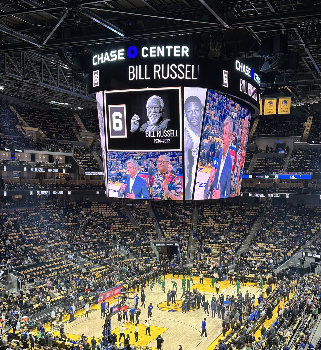 Avant la rencontre entre Golden State et Boston, et en présence de sa fille, les Warriors ont donc rendu un bel hommage au pivot légendaire des Celtics en accrochant son numéro 6 au plafond du Chase Center, aux côtés du numéro 13 de son rival et ami Wilt Chamberlain.