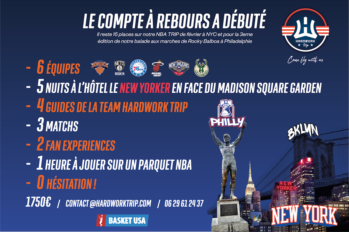 Pour 1 750 euros seulement, Hardwork Trip et Basket USA vous proposent un séjour NBA d’exception avec trois matches NBA, dans trois salles différentes ! On a ajouté 15 places au séjour, et les heureux élus auront la possibilité de jouer pendant une heure sur le parquet de Philadelphie, avant la rencontre entre les Sixers et le Heat !
