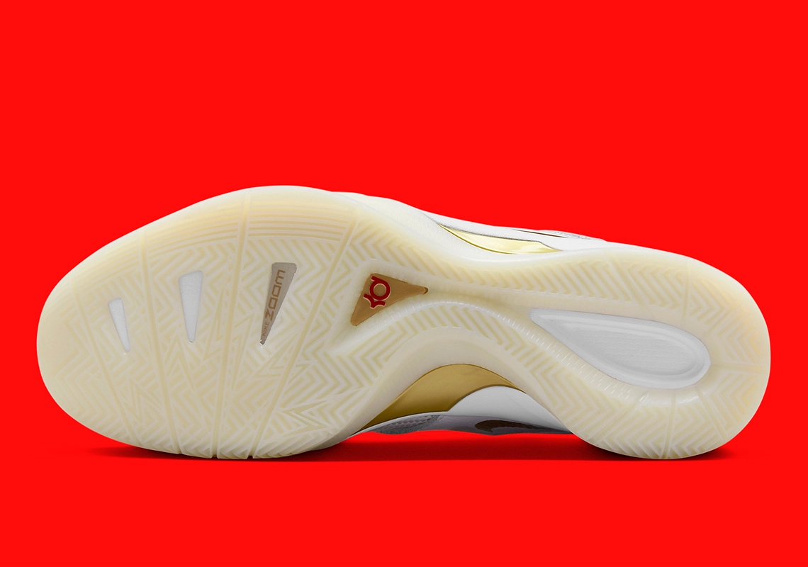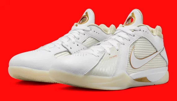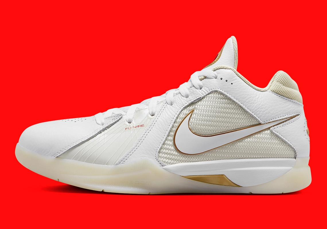 Dans le style du dernier coloris « Maccabi » de la LeBron 2, la troisième chaussure signature de Kevin Durant se présente cette fois avec une tige majoritairement en blanc-blanc nacré et des finitions dorées, comme sur le « Swoosh » et ses contours, le logo KD sur la languette, et une partie de la semelle.