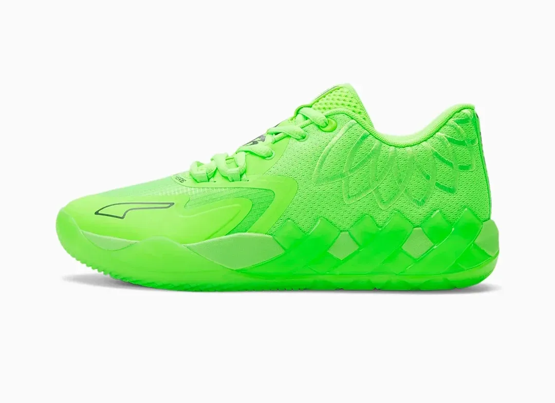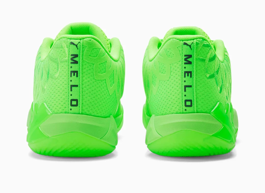 Dans le style caractéristique des différents coloris proposés pour la MB.01, on retrouve une tige en vert « Volt » uni, avec quelques infimes finitions comme différents logos et inscriptions en noir.