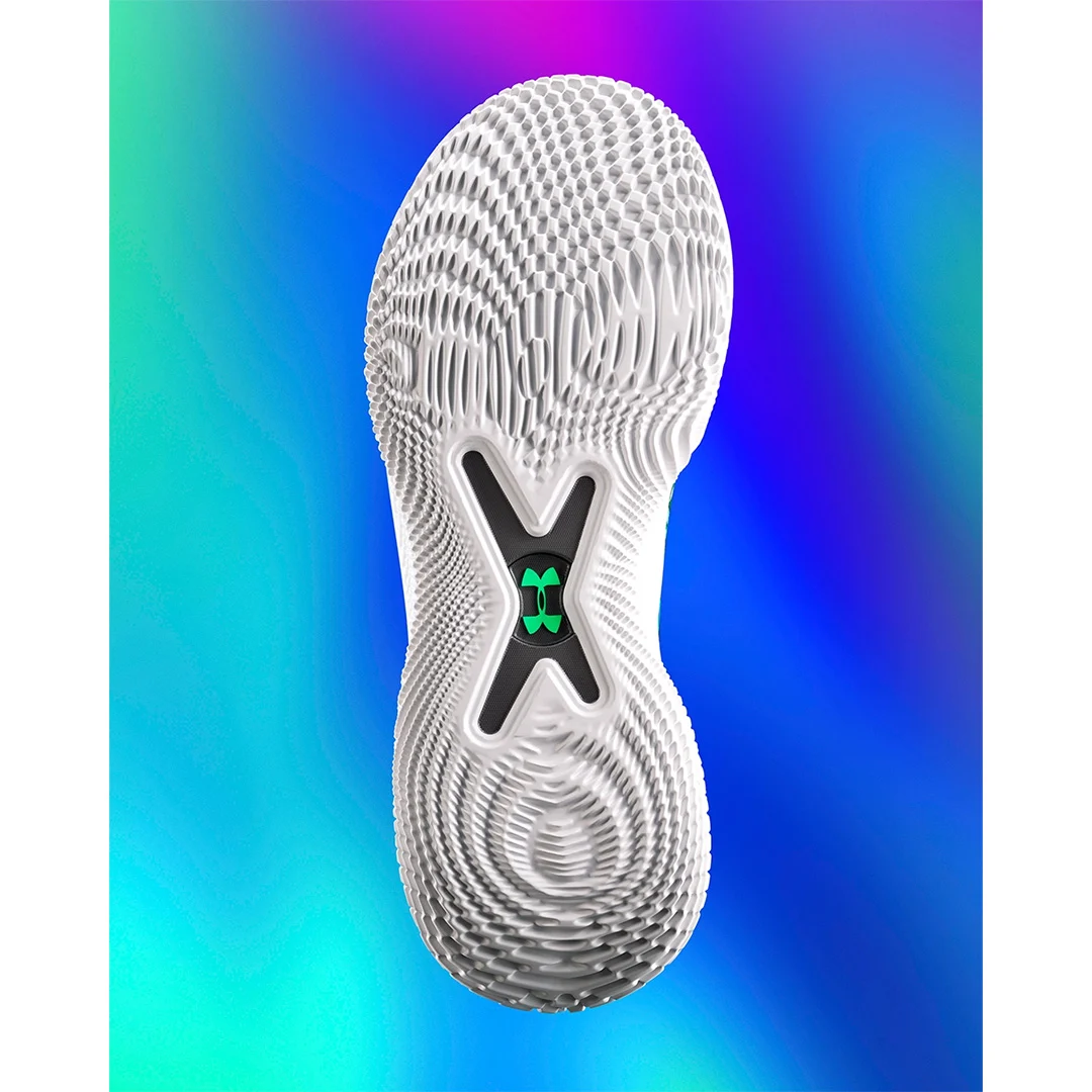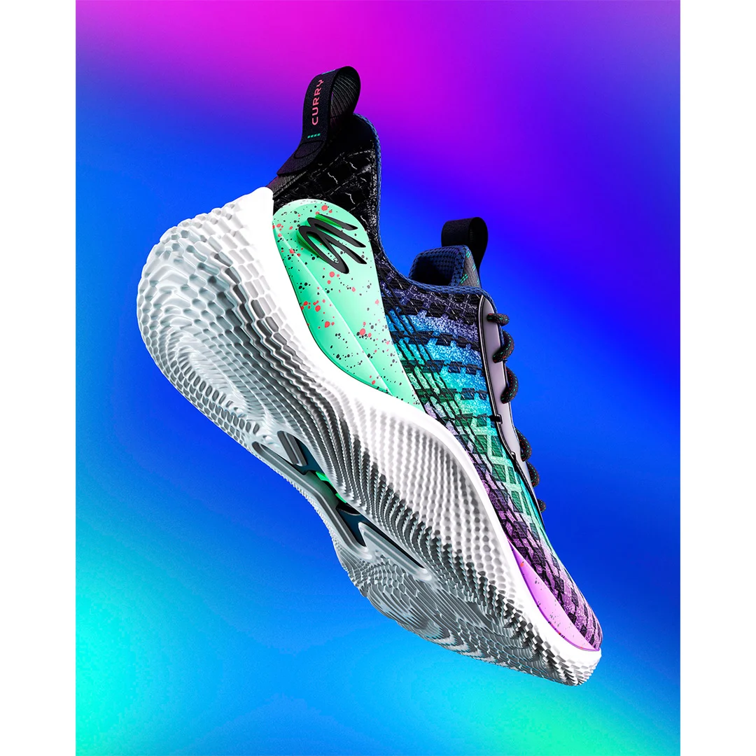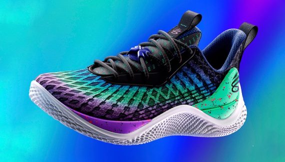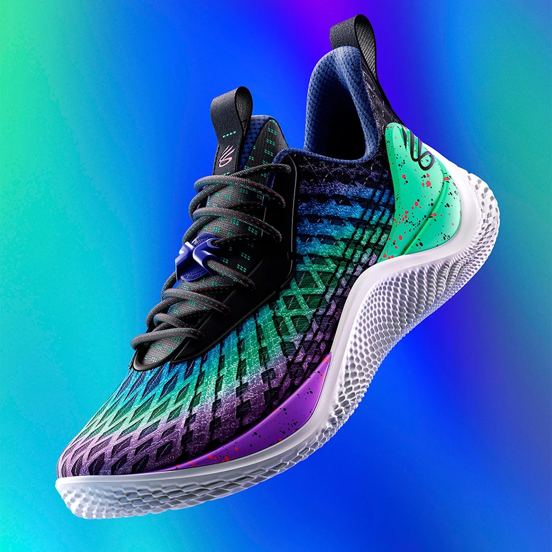 La Curry Flow 10 s’apprête donc à emprunter les couleurs des aurores boréales pour son dernier coloris nommé « Northern Lights ». Under Armour a en effet opté pour une tige UW Warp déclinée de la façon suivante sous la forme d’un dégradé, violet à la base, puis vert pour finir jusqu’au bleu nuit. La semelle intermédiaire apparaît en vert et violet tacheté tandis que la semelle extérieure “UA FLOW” complète le tout en blanc.