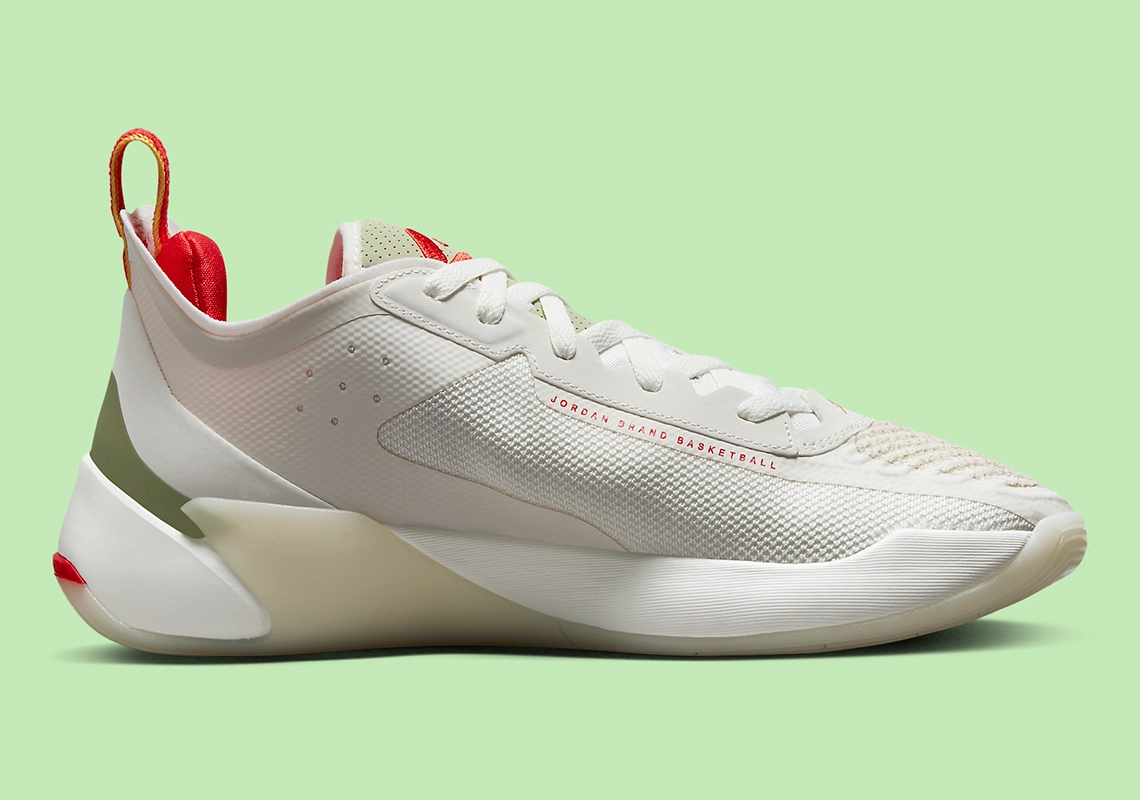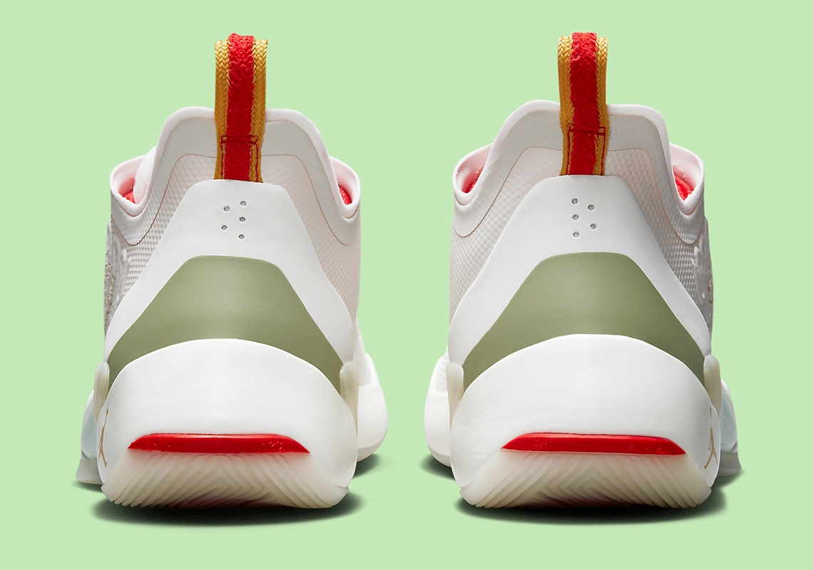 On retrouve une tige blanche avec un aspect un peu plus laineux pour recouvrir les câbles Flywire. Le logo présent sur la languette, l’intérieur du col et la tirette ressortent en rouge orange, tandis que la semelle associe également blanc, rouge et des touches dorées, sur le logo « Jumpman » notamment.