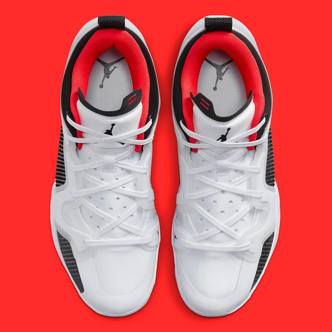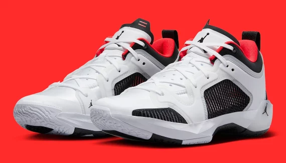 Voici donc le troisième, appelé « White – Siren Red » avec une tige blanche et ce qu’on pourrait appeler des « grilles d’aération » noires au niveau de l’empeigne. Le col et le talon ressortent également en noir, tandis que l’intérieur du col ressort en rouge, tout comme les finitions sur le talon. L’ensemble repose sur une semelle noire et blanche dotée d’un « Jumpman » rouge.