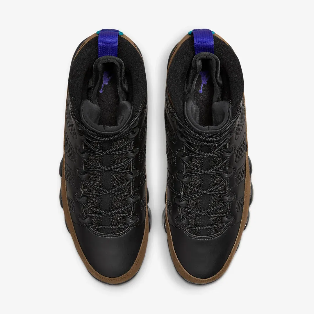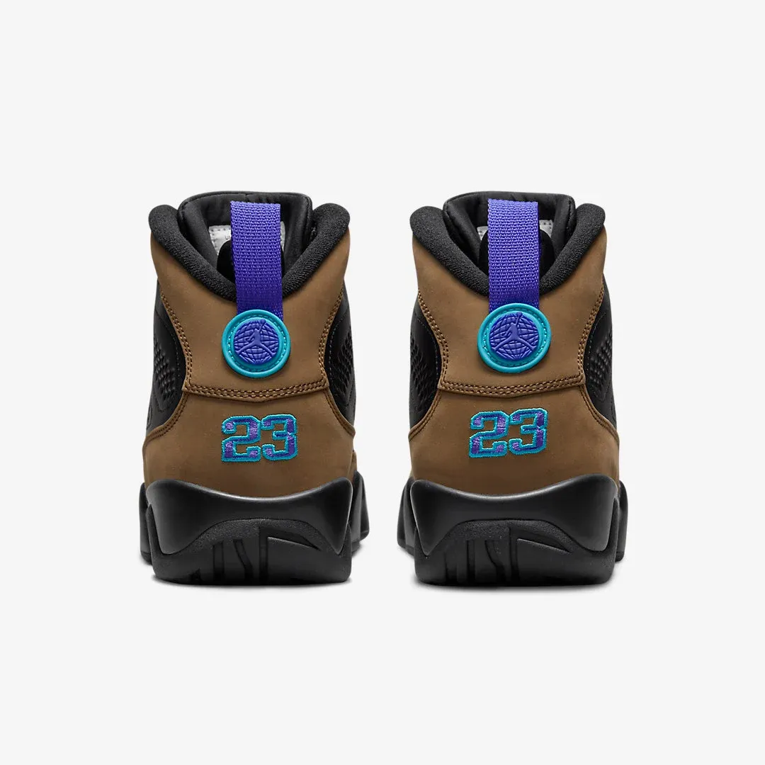 Cette AJ9 est habillée d’une tige en cuir noir, avec une bande en nubuck couleur olive à sa base, remontant jusqu’au col via le talon, où l’on trouve des finitions en violet et bleu ciel, pour le logo « Jumpman » et le numéro 23. L’ensemble repose sur une semelle en caoutchouc noir.
