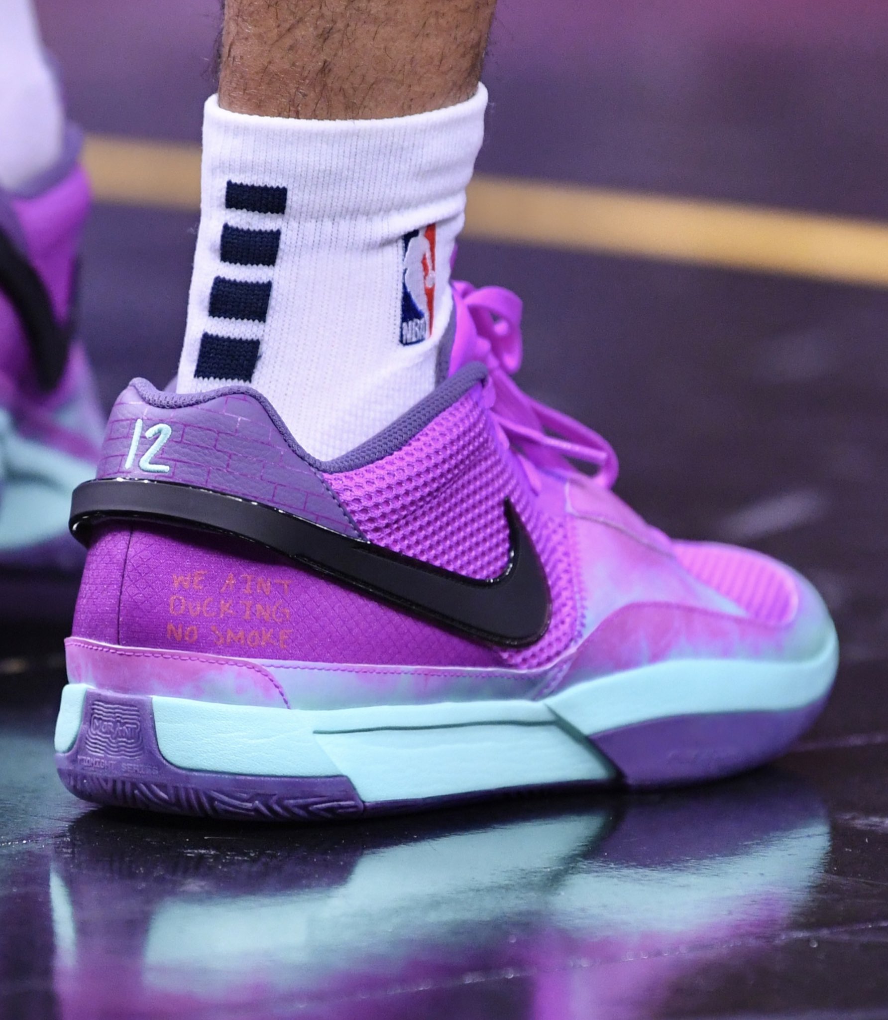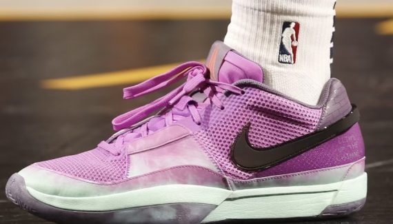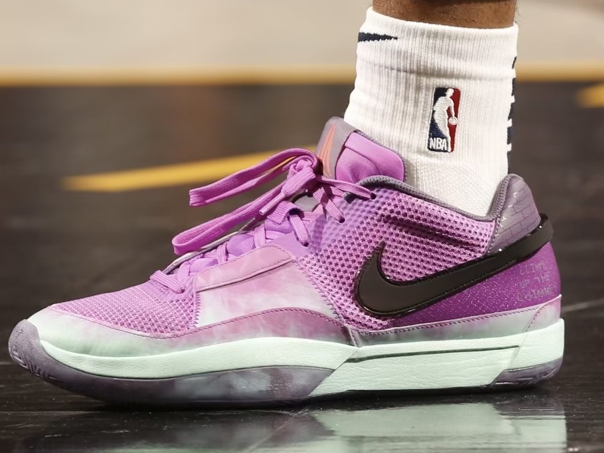 Ce coloris « Chimney » fait plutôt belle impression avec cette tige violette, un « Swoosh » en noir et une semelle intermédiaire en bleu ciel. La sortie de la Ja 1 est prévue pour avril.