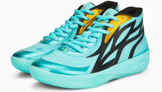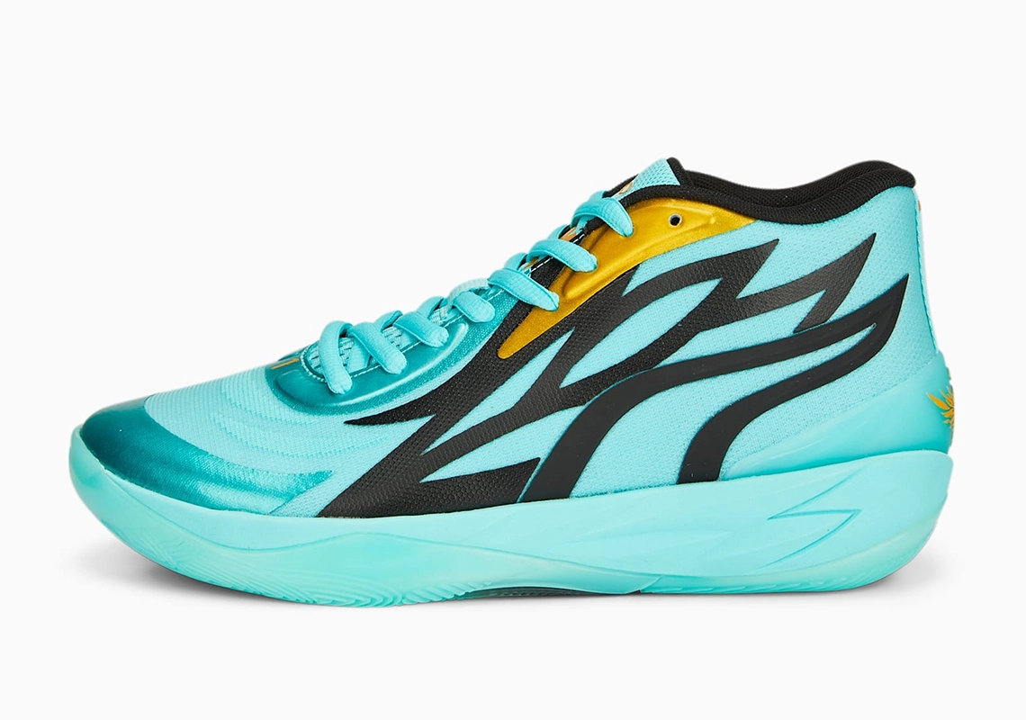 La semelle et la tige sont principalement turquoises, l’ensemble est agrémenté de notes dorées, sur le logo présent sur la languette ou le « 1 » figurant au bas des lacets. Le col ainsi que les contours des motifs présents sur l’empeigne apparaissent pour leur part en noir.