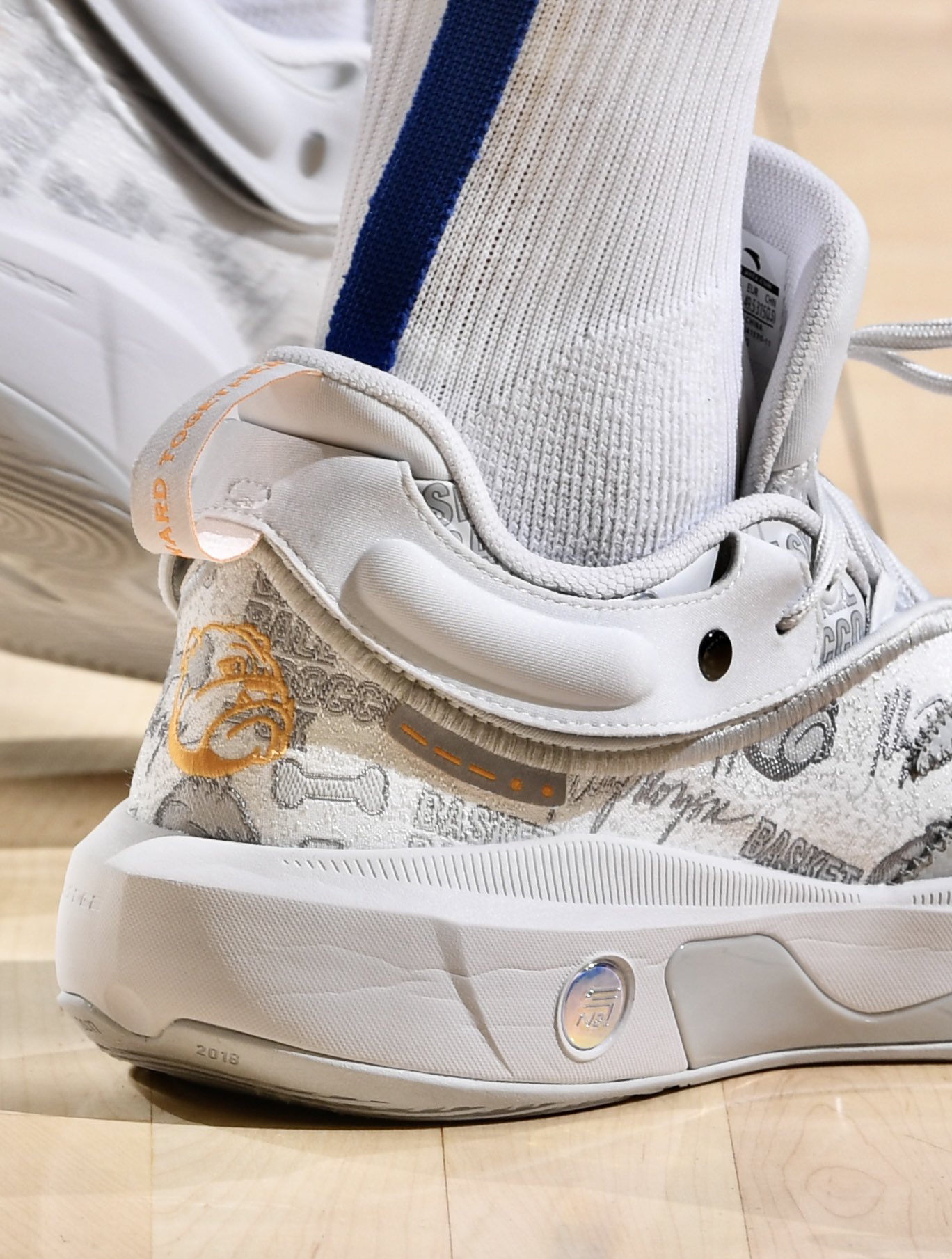 La tige habillée de teintes en blanc-gris est assortie de motifs originaux comme des os à ronger ou encore quelques inscriptions comme « Basket-ball Rocco ». Un dessin du chien de Klay Thompson se trouve même au niveau du talon en doré.