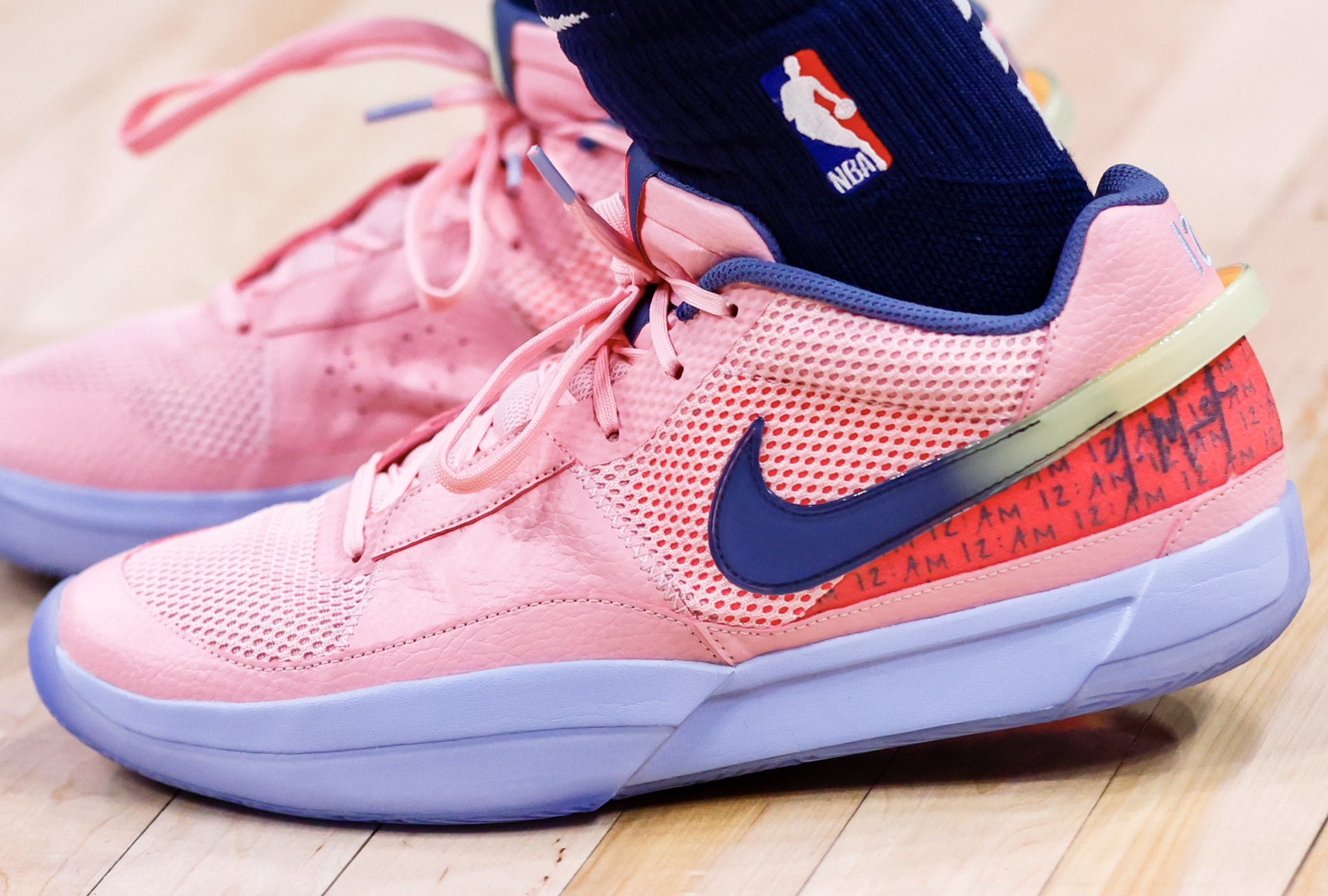 Après avoir dévoilé une magnifique version en violet et bleu ciel, le meneur des Grizzlies a cette fois arboré un tout nouveau coloris, avec une tige entre cuir et mesh entièrement rose, et une partie en orange sur le talon, où l’on distingue sa signature.